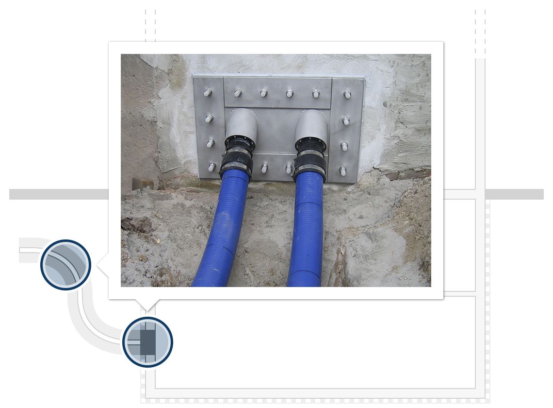 For sealing new or already installed pipes in core drill holes or wall sleeves. Available for delivery for all standard pipe sizes.