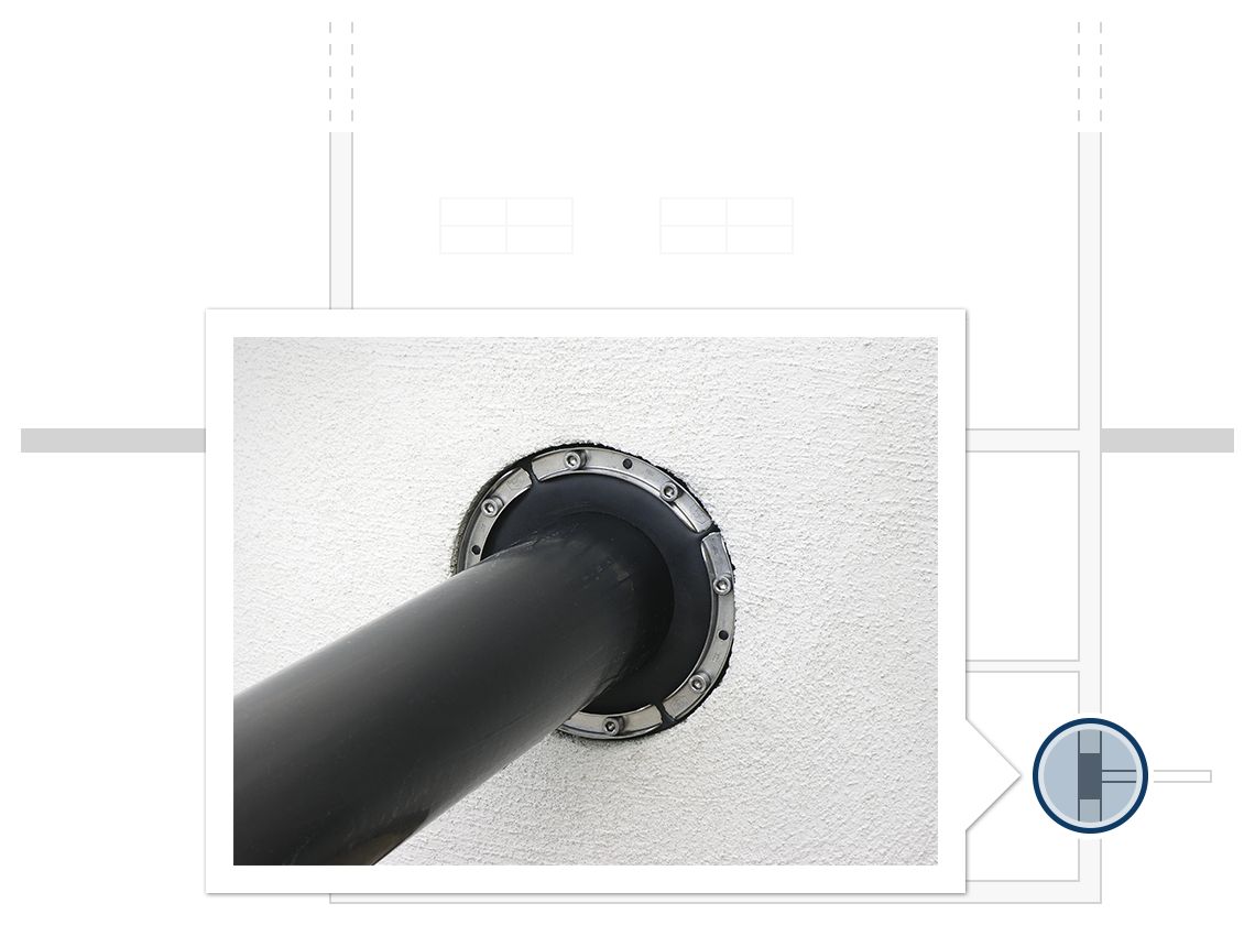 For sealing new or already installed pipes in core drill holes or wall sleeves. Available for delivery for all standard pipe sizes.