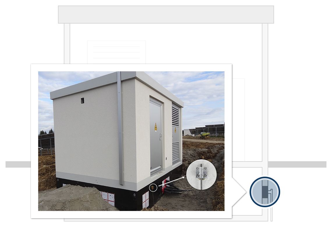 Specifically for transformer-/substations. Installed during the formwork process. Earthing connections to the building can be made with the thread on both sides.
